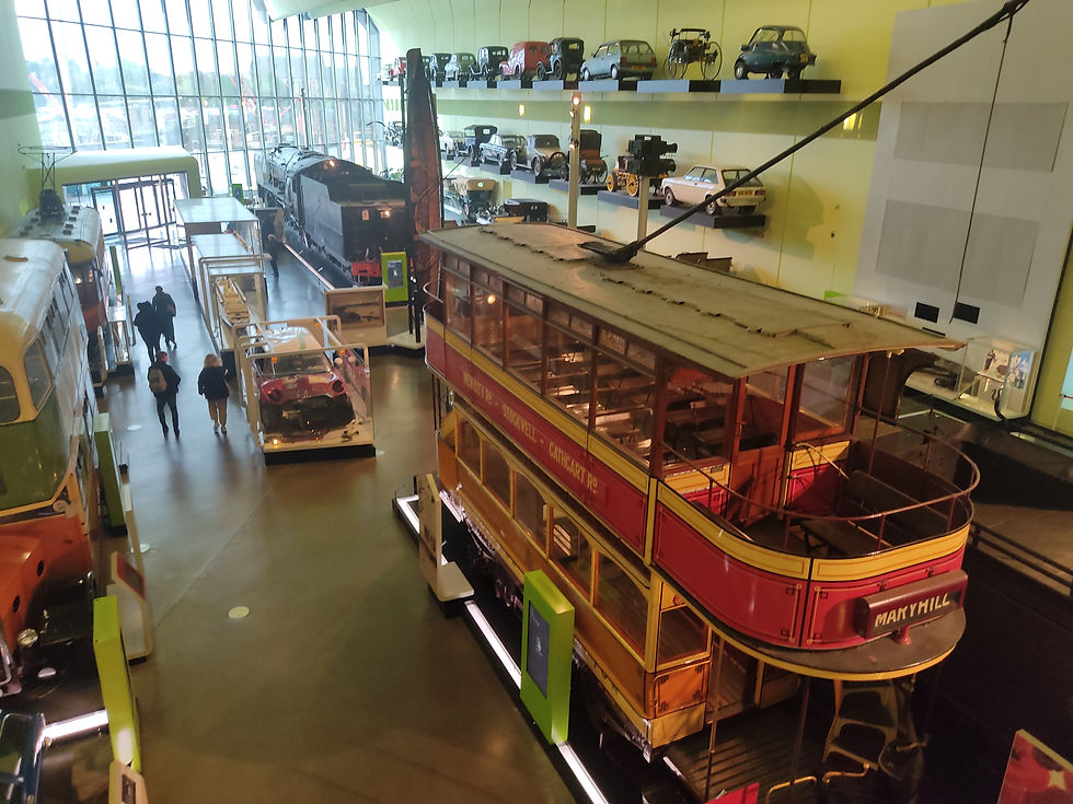 Mais c’est l’intérieur qui déclenche l’étonnement avec une riche collection de différents moyens de transport très divers : cela va du landau à la locomotive à vapeur. La mise en valeur des véhicules dénotent une grande originalité dans la conception du musée. Une rue de Glasgow du début du 20ème siècle avec des voitures de l'époque a même été reconstitué comme un décor de cinéma.